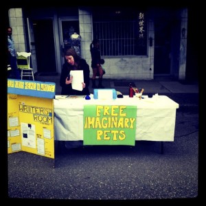 One of the things I do for fun is give away free imaginary pets. At a recent Main Street Car-Free Festival, I gave away 64 imaginary pets, from cats and dogs to unicorns and a reindeer fairy. People filled in an imaginary-pet order form and the pets were delivered to them that night, in their dreams. Giving away free imaginary pets is actually an opportunity to get kids reading and writing, so it’s an example of my all-time favourite activity: enabling people to flex their literacy muscles in creative ways.